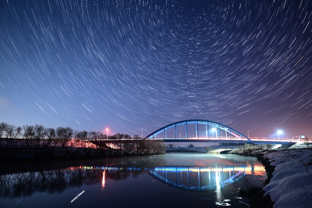 雪あかりの舞鶴橋と星空