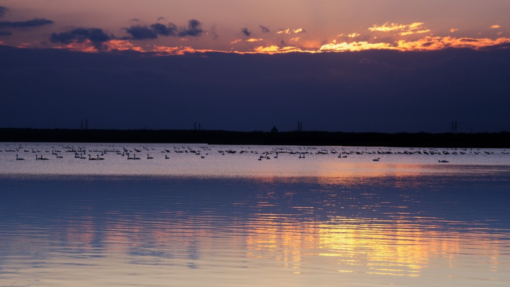 白鳥が羽を休める早朝のウトナイ湖