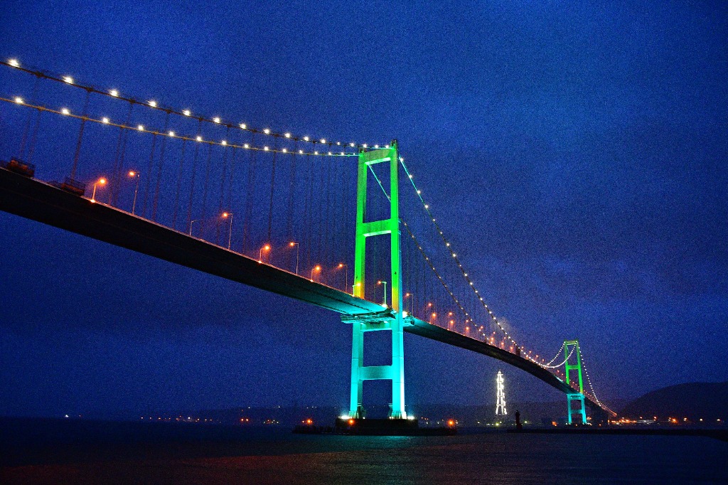 2色にライトアップされた白鳥大橋